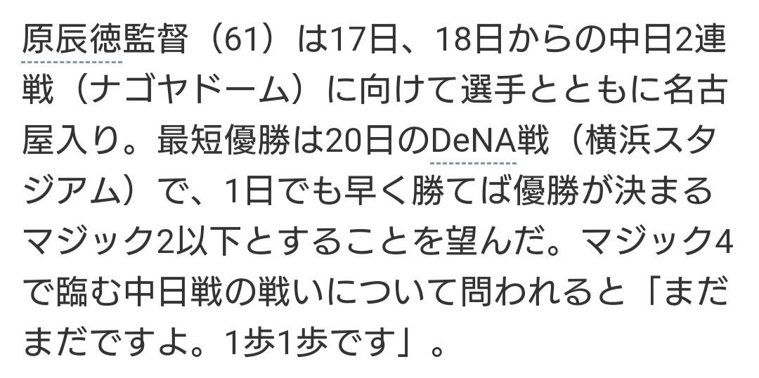 95 風吹けば名無し :2019/09/18(水) 07:16:26.59 ID:UkXJh/wh0.net巨人こんな状態やし横浜が頑張ればまだ逆転できるやろ