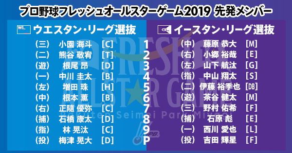 イースタン 吉田(日)、中川(デ)、鈴木(日)、松本(西)、清水(ヤ)、中村(ロ)、戸郷(巨)、本田(西)-石原(楽)、岸田(巨)