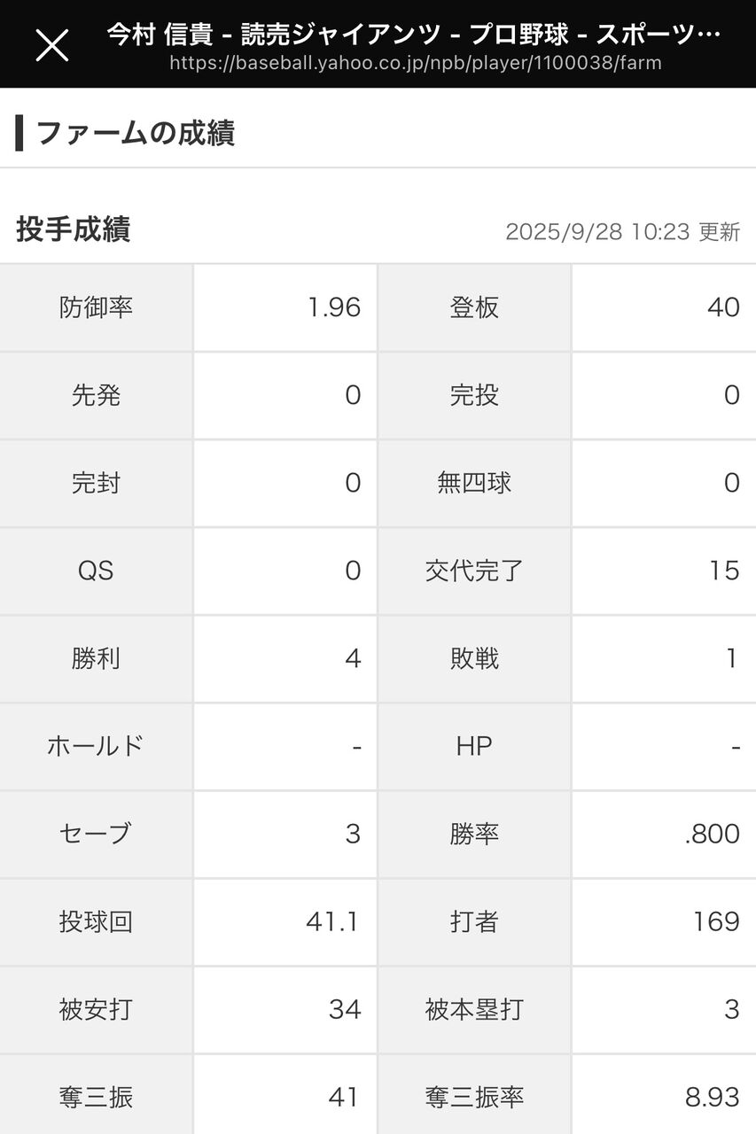 今村選手の素晴らしいパフォーマンスについて、ファンとして心配しています。2軍での40試合登板で1点台の防御率は驚異的で、どうして1軍での登板機会がないのか理解できません。早く1軍での活躍を見たいです!